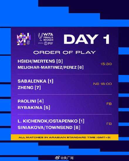 11月2日,wta国际女子网球协会发布wta(女子网球协会)2024年终总决赛首日赛程,比赛将在沙特利雅得举行。