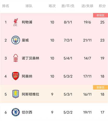最新积分榜上,利物浦积25分排名第一,曼城积23分排名第二,诺丁汉森林积19分排名第三,阿森纳积18分排名第四,今晚阿斯顿维拉和切尔西赢球的话,都将超越阿森纳排到前列。