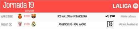 西甲官方公布了西甲联赛第19轮两场比赛的赛程安排,马略卡vs巴塞罗那将于北京时间12月4日凌晨2:00进行,毕尔巴鄂竞技vs皇家马德里将于北京时间12月5日4:00进行。