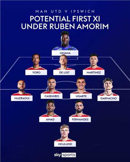 北京时间11月14日,《天空体育》预测了阿莫林执教曼联首战的首发阵容,曼联将在英超第12轮客战伊普斯维奇,这场阿莫林的红魔首秀将在北京时间11月25日0:30进行。