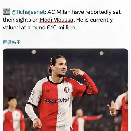 阿尼斯·哈吉·穆萨,他在费耶诺德的最近7场比赛中打进6球,包括重要的欧冠进球。据说费耶诺德对阿尼斯·哈吉·穆萨的标价为1000万欧元,米兰期待用更小的代价把阿尼斯·哈吉·穆萨收入囊中。米兰蒙卡达对阿尼斯·哈吉·穆萨评价很高,这次没找到蒙卡达之前推荐阿尼斯·哈吉·穆萨的新闻,貌似这个哥们是突然被提出来的,弗拉尼说荷甲球员很适合意甲的节奏,雷恩德斯在米兰的表现就非常出色,我们未来会加大与荷甲俱乐部的合作。