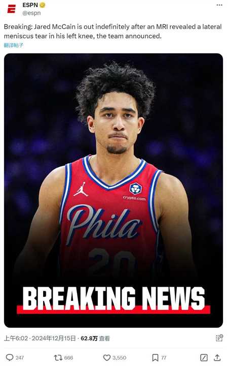 北京时间12月15日,一则伤病新闻:据espn报道,费城新秀贾里德-麦凯恩遭遇左膝半月板撕裂,他将无限期休战。医疗专家brian sutterer透露,如果手术切除半月板,需要4-6周恢复!如果麦凯恩选择保守治疗,他本赛季就报销了。