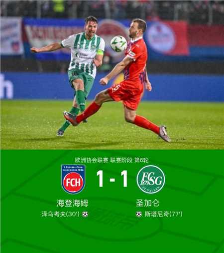 北京时间12月20日欧洲协会联赛 联赛阶段 第6轮,海登海姆对阵圣加仑。海登海姆泽乌考夫破门。圣加仑斯塔尼奇破门。最终比分海登海姆 1 - 1 圣加仑。