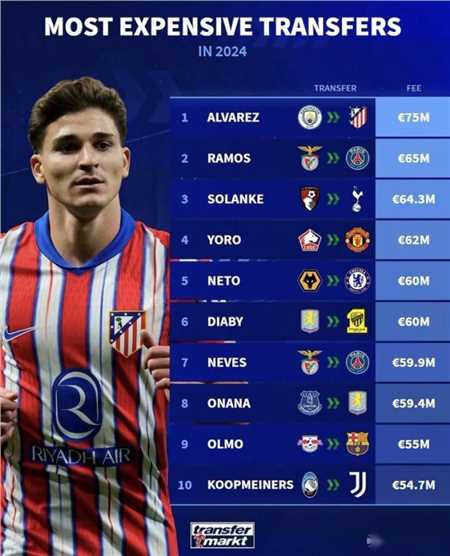 在2024年即将结束之即,德国转会市场统计了今年的最贵转会榜,阿尔瓦雷斯以7500万欧转会费居首。