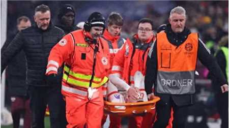 此役,拜仁控球率71%,22次射门9次射正打进5球,而客场作战的rb莱比锡仅有4射1正打进1球。而在伤停补时第2分钟,莱比锡右后卫亨里西斯在没有任何对抗的情况下痛苦倒地,队医紧急进场 治疗。直到终场哨声响起的几分钟后,这位德国国脚边卫双手捂脸被担架抬走。慕尼黑当地时间11点30分左右,亨里西斯拄着拐杖、右脚穿着保护靴离开了安联球场。