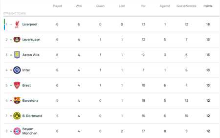 利物浦欧冠6战6胜,作为唯一全胜(不败)的球队高调领跑积分榜,但他们却并非高枕无忧,事实上,利物浦仍处于已提前锁定附加赛名额(前24),但未锁定直接出线名额(前8)的状态。