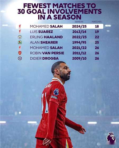 根据英超官方统计,萨拉赫成为英超历史最快单赛季参与30粒进球的球员,他只花了18场比赛就达成了这一目标,排在他身后的是2013/14赛季的苏亚雷斯和2022/23赛季的哈兰德等。官方表示:“我们是不是正在见证英超联赛有史以来状态最好的球员?”