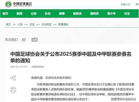 中国足协在官网公布了获得2025赛季中超、中甲参赛资格的俱乐部名单,中超2025赛季16支参赛球队分别为:上海海港、上海申花、成都蓉城、北京国安、山东泰山、天津津门虎、浙江队、河南队、长春亚泰、青岛西海岸、武汉三镇、青岛海牛、深圳新鹏城、云南玉昆、大连英博、梅州客家。