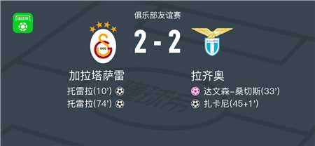 北京时间8月3日,一场俱乐部友谊赛在加拉塔萨雷与拉齐奥之间 。比赛中,加拉塔萨雷球员托雷拉先后两次攻破对方球门,为球队贡献了关键进球。比赛过程中,加拉塔萨雷球员达文森-桑切斯不慎自摆乌龙,为对手送上一分。拉齐奥方面,扎卡尼在上半场补时阶段破门得分,帮助球队扳平比分。最终,双方以2比2握手言和。